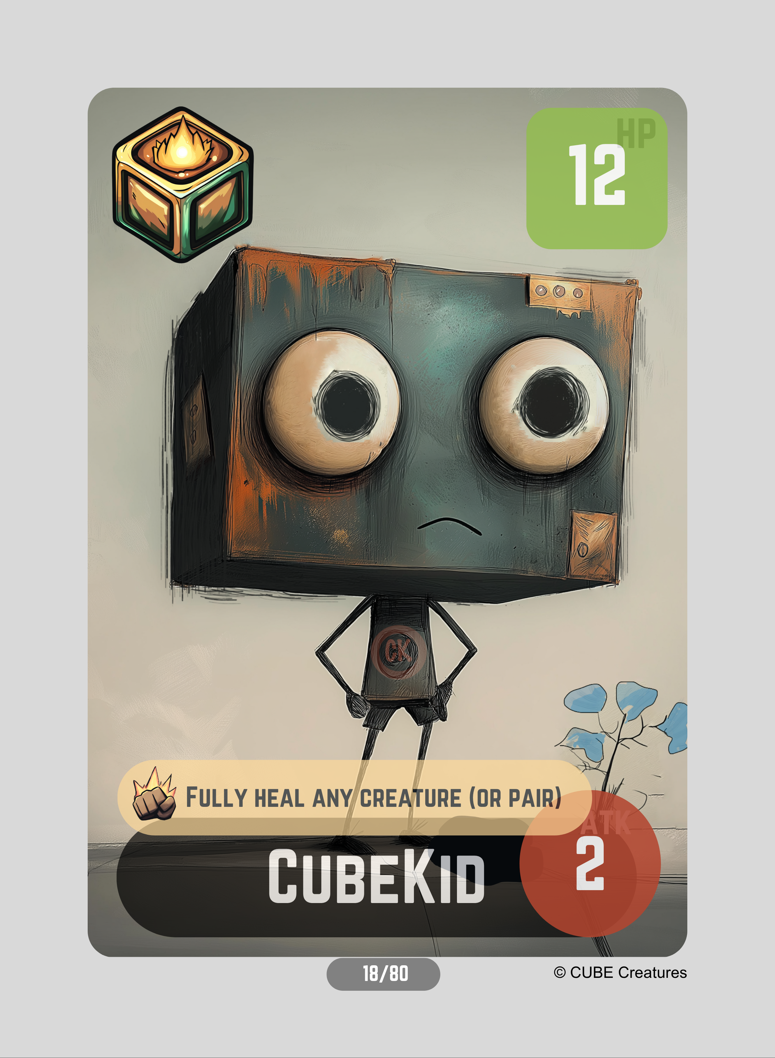 Alternative art version of Cube Kid. He's shy with a heart of gold and pockets full of bandages. When your creatures are in trouble, he’s the first to patch you up with a smile and a weird snack.